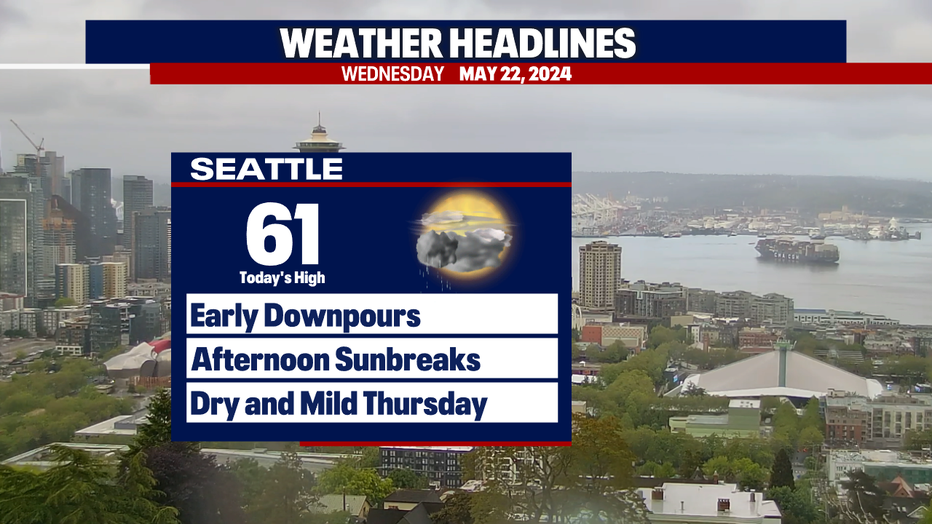 Showers taper later today. Morning clouds and afternoon sunshine are on tap Thursday. (FOX 13 Seattle)